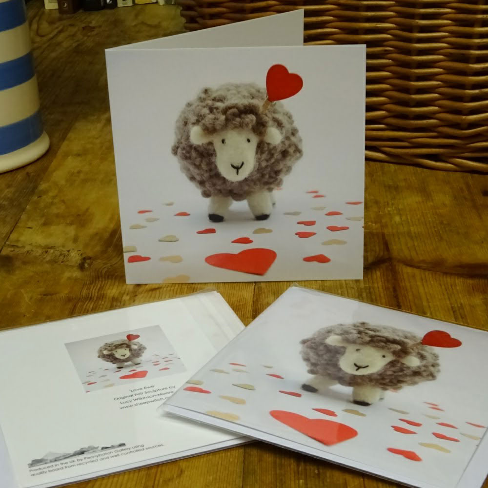 This card is a print of an original Felt Sculpture (which is now sold) that I created using the needle felt technique. The sculpture was made entirely from unspun, undyed Blue-Faced Leicester and Lleyn wool – and lots of poking with a sharp barbed needle!
